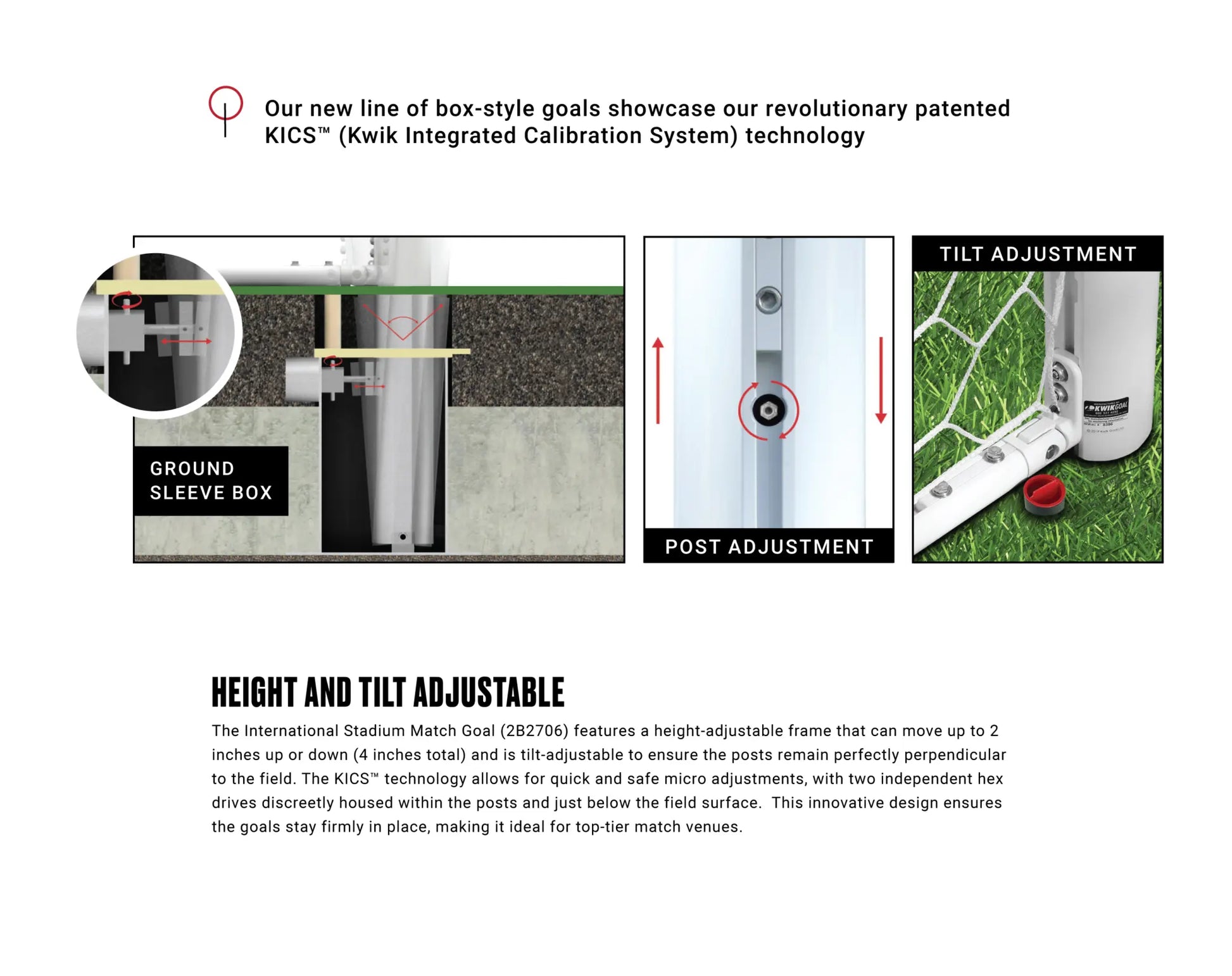 The International Stadium Match Goal sets the standard for elite competition, chosen for all 16 venues in the 2026 world’s biggest sporting event. Its patented KICS™ technology offers quick and precise height and tilt adjustments, keeping posts perfectly aligned. With built-in safety padding and a design that ensures stability, this goal is engineered for performance at the highest level. Secure yours today for professional-quality play.